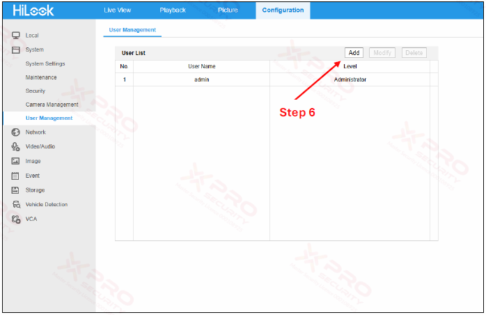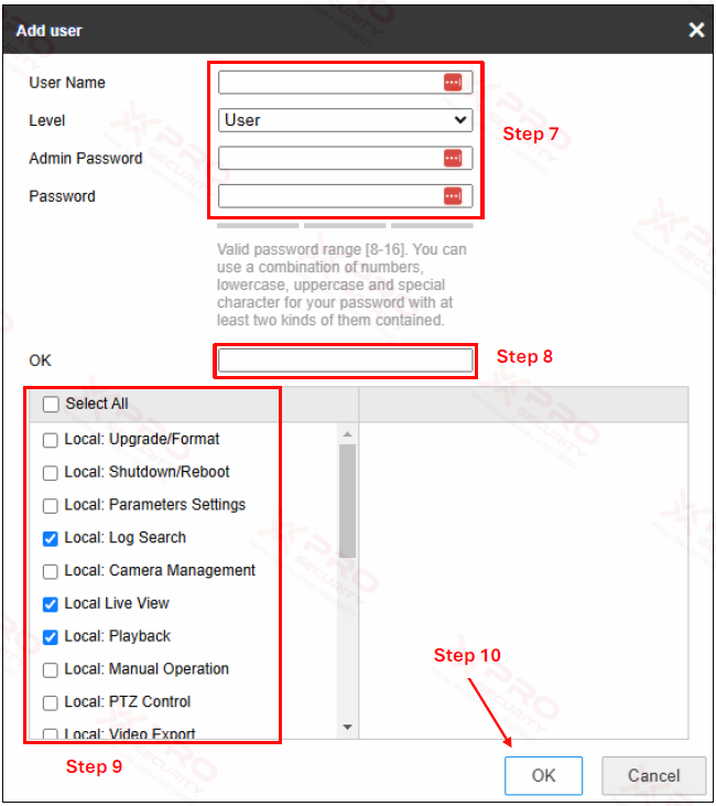Step 7: Enter Username, select level, enter the admin password, and create a password for the new user.